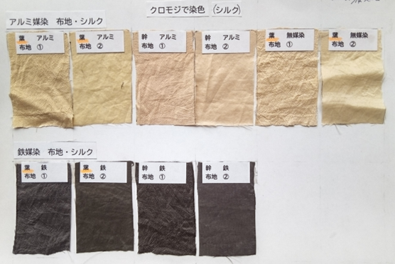 初めての試みの結果は 下記の写真(シルク染めのみ、綿は省略)の通り。