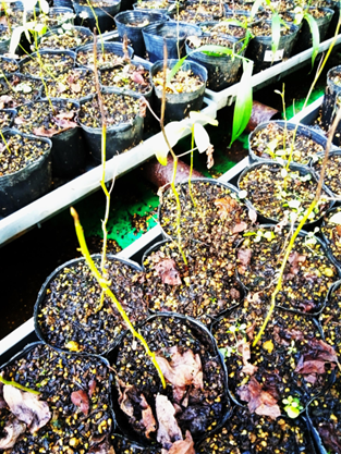 ビニールポットで育苗、ベンチを作り地面より高くして栽培している。ポットの底穴から根が張り出すことを防ぐためであるが。