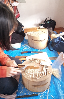| 冊は表皮を残して三面を削り四角にする。幅、厚み、長さは楊枝の種類により様々となりますが、刃の削り跡が残らないように四角に削れることが大事です。 | 削り屑は ポプリに? またお風呂に入れて香りを楽しみたいと、持ち帰られました。 |